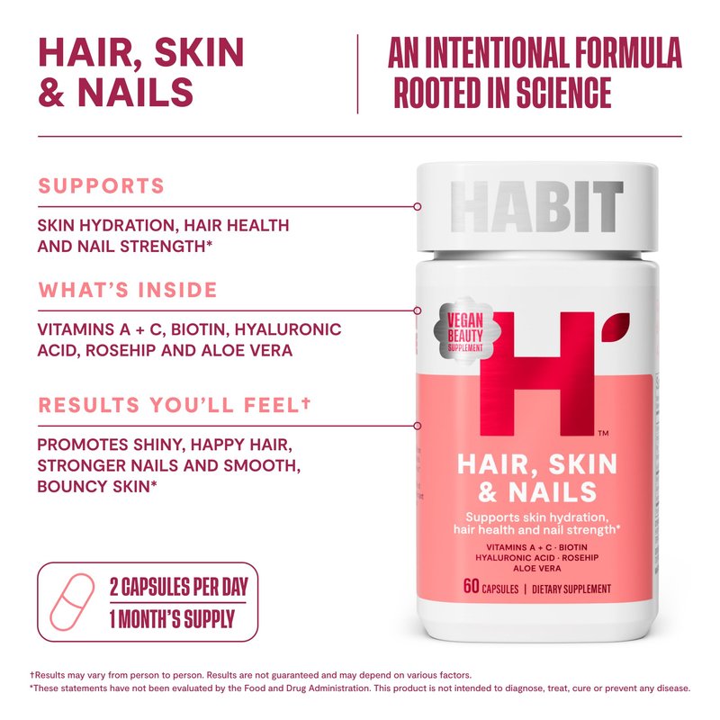 - INSIDE-OUT WELLNESS: Begin within. HABIT's Hair, Skin & Nails supplement helps support inner health for outer vitality with science-backed nutrients and time-tested plant extracts*.