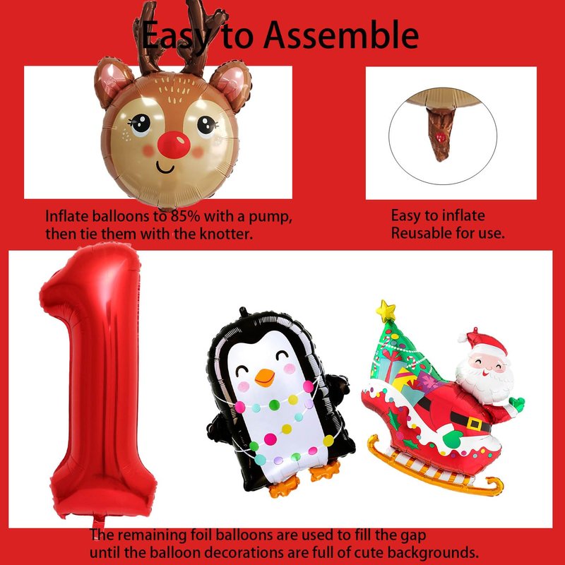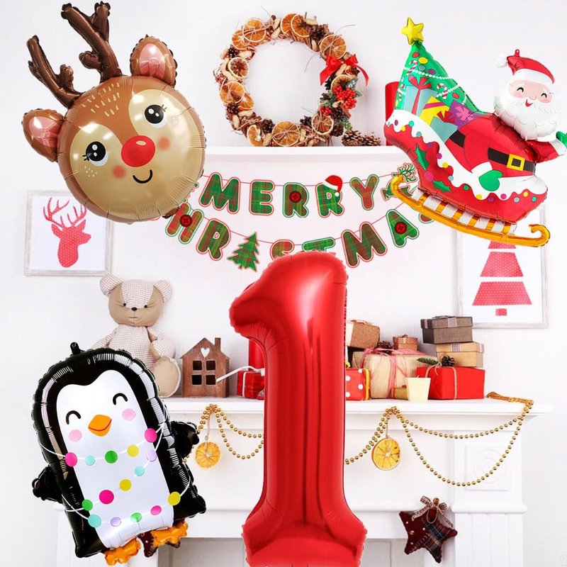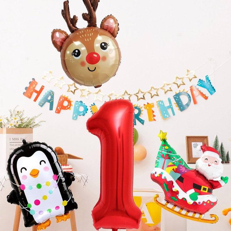 - 【Christmas Birthday Themed Decorations】:The Christmas birthday balloon set features a fun and very amazing design that is perfect for those looking to add a touch of excitement to their birthday party. The large red 1st foil balloon and reindeer balloon Santa Claus balloon scheme create a Christmas atmosphere, while the penguin balloon add a touch of fun. Whether you're hosting a boy's girl's birthday party or a boy's girl's shower is sure to impress your guests.
