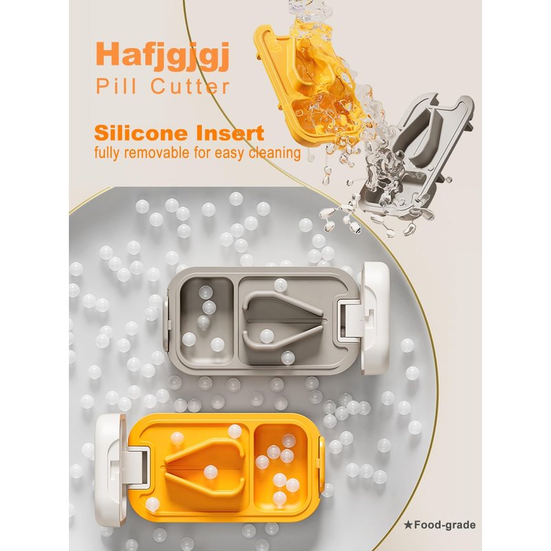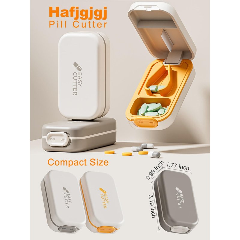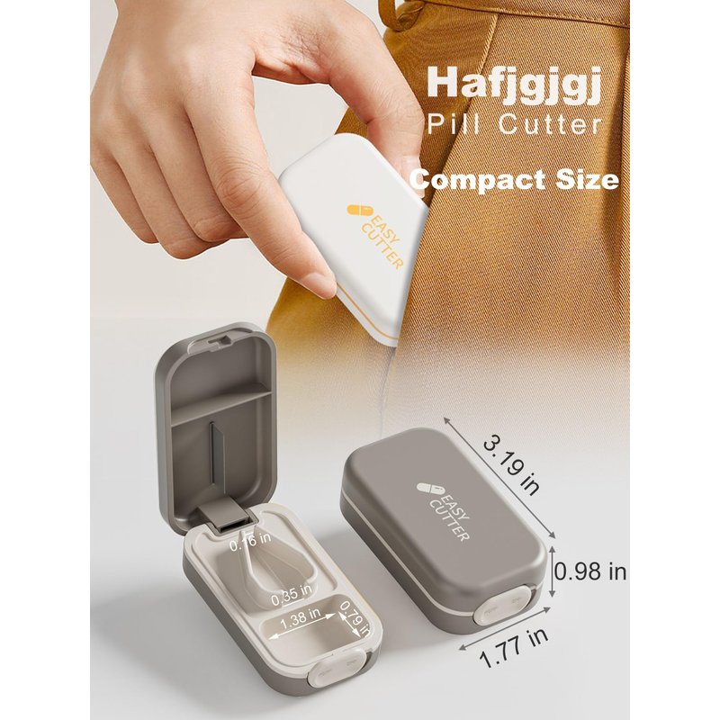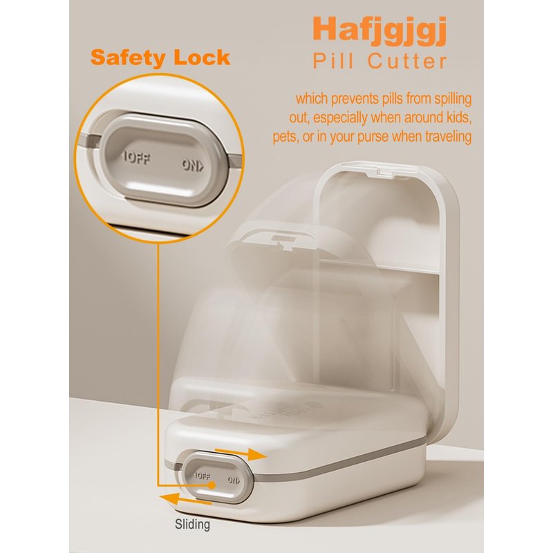 Hafjgjgj Pill Cutter -Tablet Splitter for Healthy Living These pill cutters have made splitting doses safer and easier. Features like silicone non-slip liners, storage compartments, and a safety lock make cutting pills safe. Features: + Simple Cutting Action - Cuts and Splits medication efficiently with only light pressure applied by you. + Professional V-Centering Device: For any pill up to 0.8 inches, whether small or large pills, this cutter makes it easy to cut pills or tablets to 1/2 or 1/4 size. + Safety Lock: There is a slider button that allows for a locking lid feature with a simple slide, which prevents pills from spilling out, especially when around kids, pets, or in your purse when traveling. + Secure Storage Area: The splitter has an area for storing split pills and non-split pills that can hold 4-10 pills. + Easy to Use: The silicone liner better prevents accidental tablet movement, while the fully removable insert makes cleaning easy. + Portable design: Compact size, easily fits into your handbag or pocket for easy storage and travel. + Available in multiple colors, ideal for daily use, traveling, office, and business. Package Information:Box Material:Steel and plastic,Silicone Special Feature:Easy Open, Safety Lock