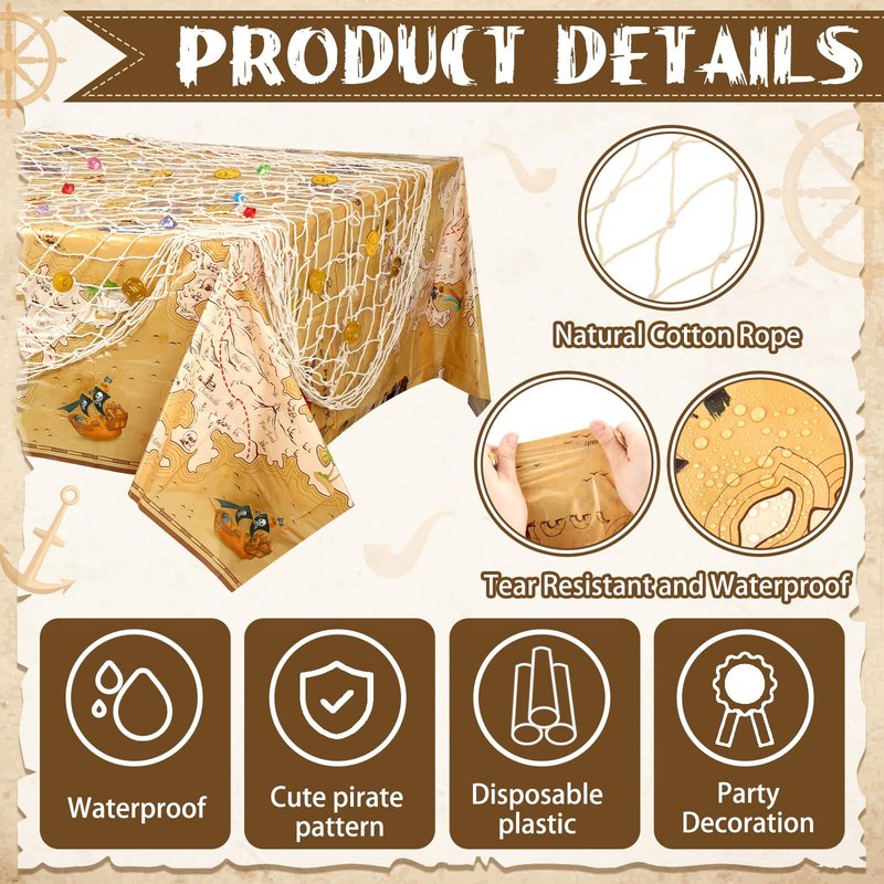 - Pirate Paradise Design: our pirate birthday party decorations set has been designed with distinct pirate patterns such as skulls, ships, mountains and compasses printed on the tablecloth to bring the fun adventure atmosphere to your party; Simply spread the cotton thread decorative fish net over the tablecloth and gold coins and jewels on it to transport your guests to a thrilling pirate world