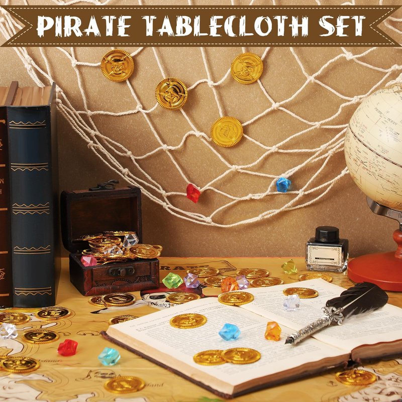 - Host the Pirate Party: this complete pirate party decoration set includes 3 pirate party tablecloths and 3 decorative fish nets, coupled with 50 pirate gold coins and 20 pirate gems to transform your party space into ideal pirate island; This pirate party set is an immense addition to many pirate themed parties or nautical themed decors that provides an unforgettable experience