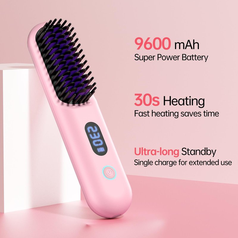 Hahahope Cordless Hair Straightener Brush-Portable Straightening Comb,9600mAh Batt, Plasma Tech, 9 Temp-Settings&LED Display,for Travel&Home(Pink)