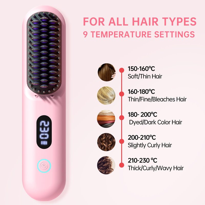 - 【Cordless&Worry-Free】Combining lightweight portability with the freedom of cordless use,hair straightening brush allows you to style your hair anytime, anywhere, eliminating the hassle of tangled wires. Weighing no more than your phone,brush comb effortlessly glides through your strands, keeping your hair straight all day long.(Tip: To prevent accidental touch,need 2-second long press switch to turn on)