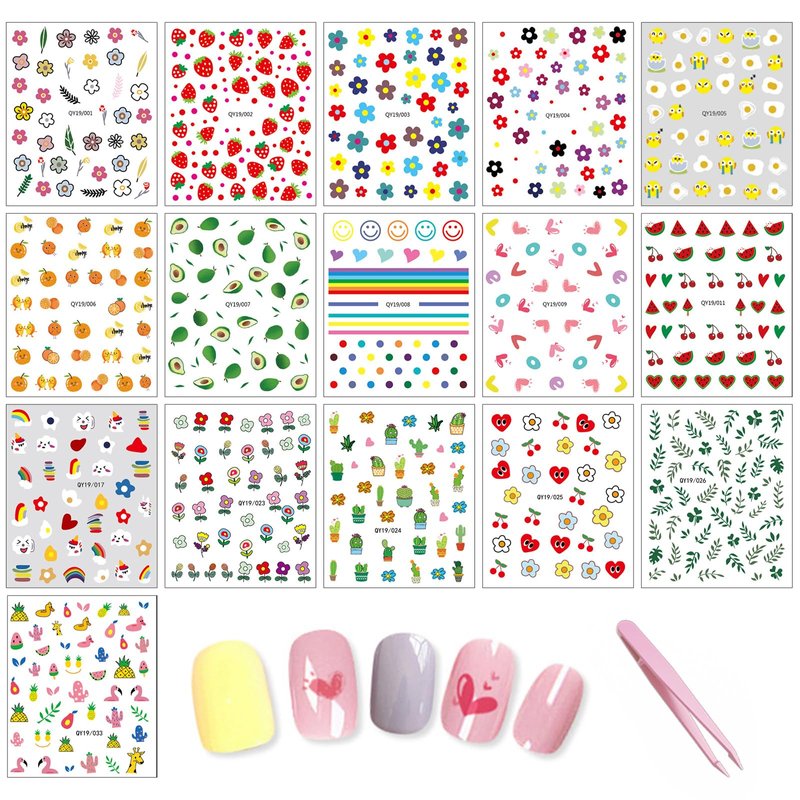 - Quantity: Includes 16 sheets of stickers and 1pc tweezer, featuring a variety of floral, animal, and other patterns. These self-adhesive designs offer endless options. This allows you to achieve a look similar to what a professional manicurist would create without a costly trip to the salon. Nail art stickers are typically more forgiving than polish strip stickers.