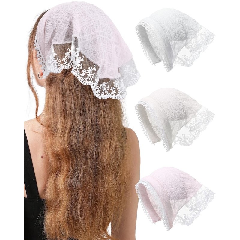 HAIMEIKANG Hair Scarf Bandana Handband for Women - 3Pcs Chiffon Head Scarf for Women's Hair, Non Slip Lace Triangle Kerchief Women’s Hair Bands (Solid Color)