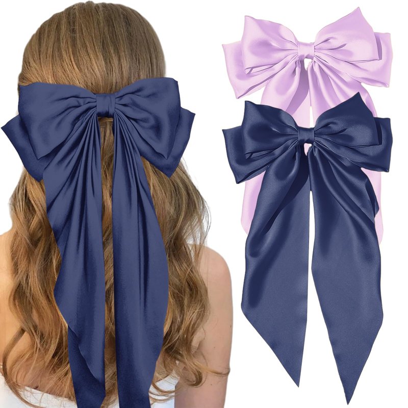 Hair Bows for Women, 2 pcs Big Silky Satin Bow Hair Clips, Metal Clips Long Tail Accessories Hair Bows for Girls for Birthday Gift (Navy Bow & Lilac Bow)