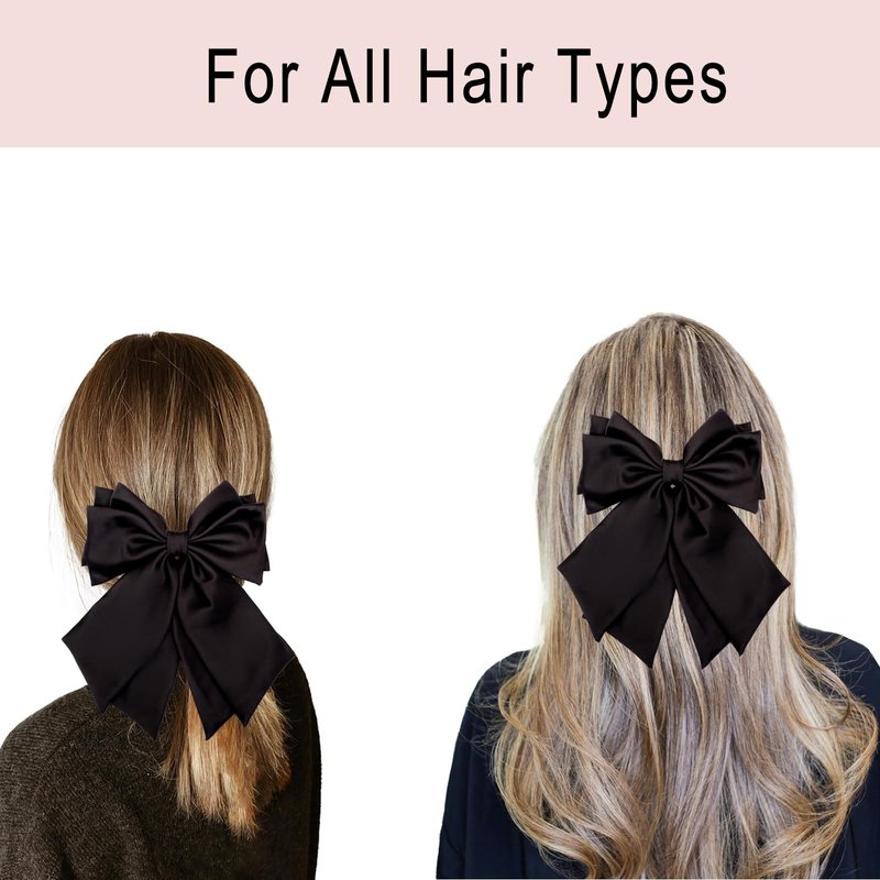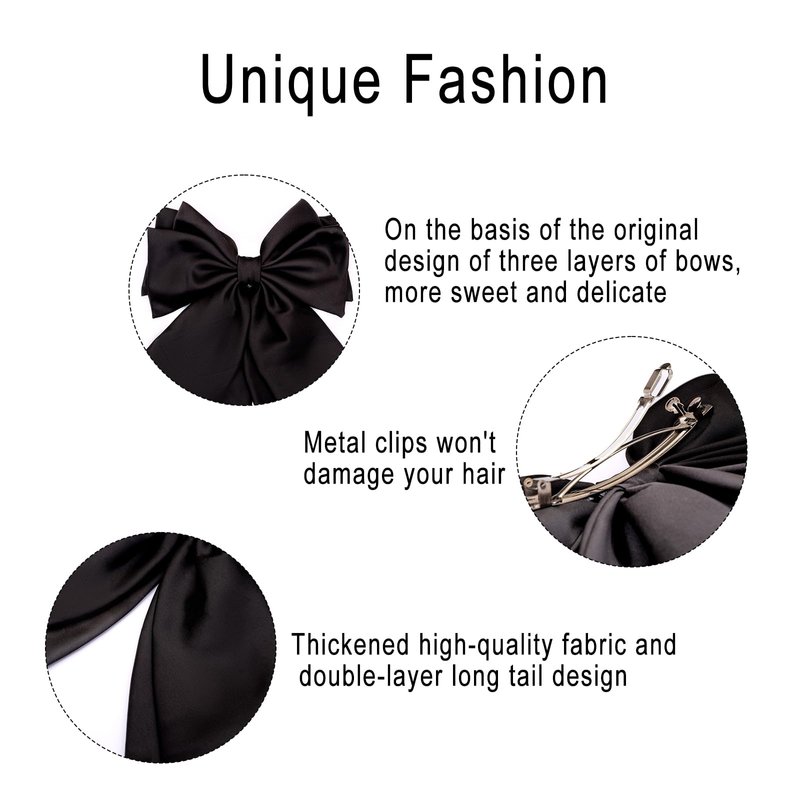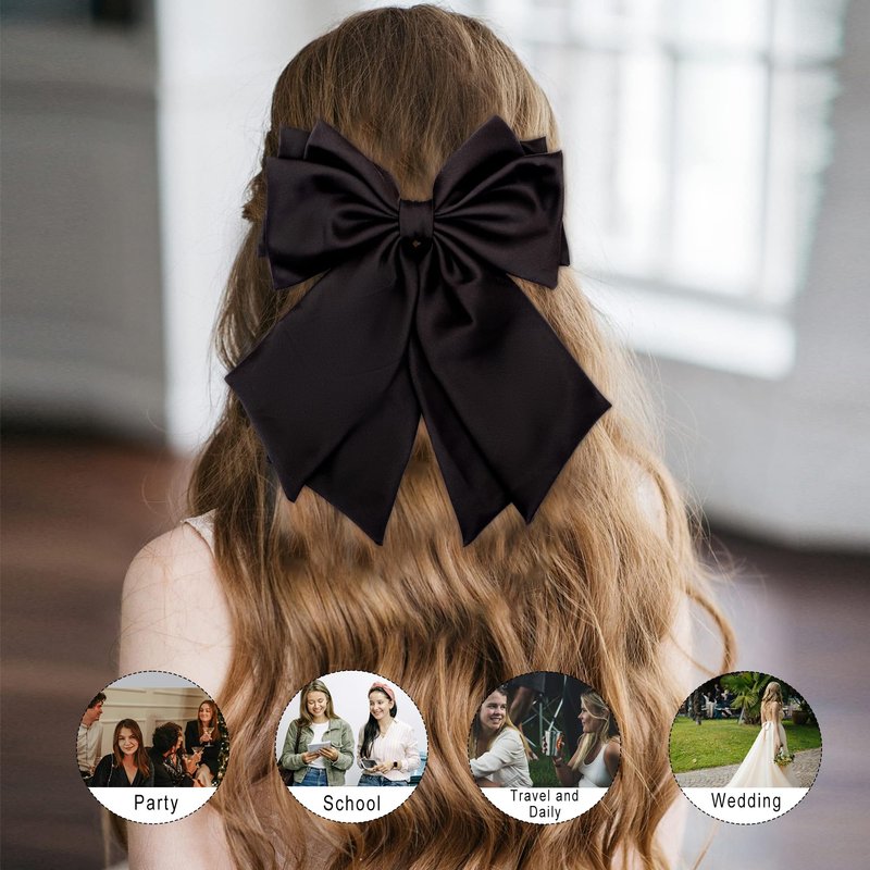 - 【Premium Quality Fabric】The big hair bows are made of high quality satin fabric to create a lustrous effect and has a large metal clip.These girls hair bows are easy to use and not easily broken. The black hair bow has a firm grip that tightly grips your beautiful hair, does not fall out easily, and does not damage your hair.