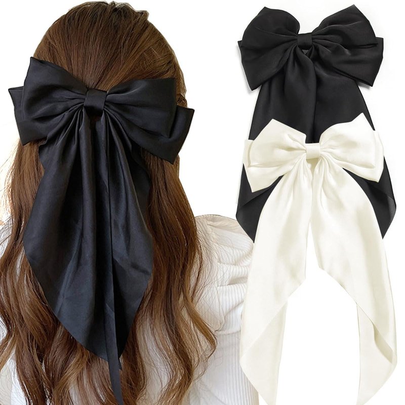 Hair Bows for Women,Satin Bow Barrette Hairclip Long Tail Ponytail Holder Wedding Party Hair Accessories (Black+Beige)