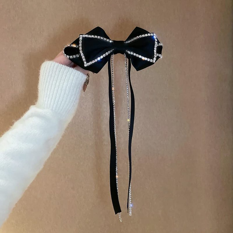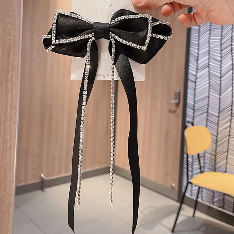 Hair Bows Sparkly Rhinestone Tassel Hair Clips Barrettes Black Bowknot with Long Brocade Tassel Ribbon Claw Hair Accessories for Women and Girls