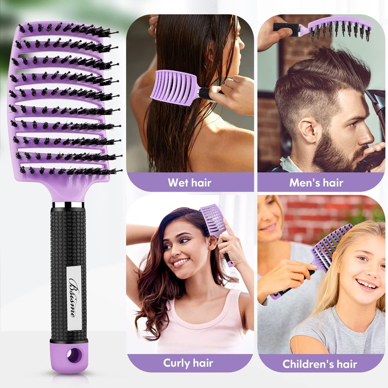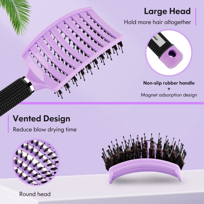 Hair Brush, Boar Bristle Hair Brushes for Women Men kids, Curved Vented Styling Hairbrush Faster Blow Drying, Paddle Detangler Brush for Wet Dry Curly Thick Hair Smoothing Massaging Detangling(Purple)