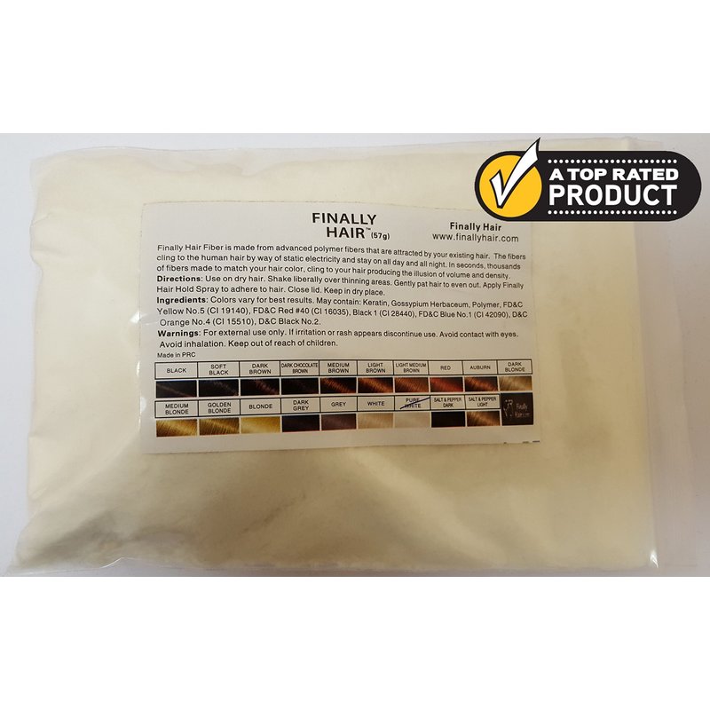57 Gram Refill - THE BEST HAIR FIBERS ON THE MARKET Real Keratin Fibers - No cotton or fillers like many others. Most Applicator Bottles reopen. See our pictures to see how Finally Hair bottles open. Anti-Clump Formula - Doesn't clump up or absorb moister and get fat. Clean Pillow Formula - Hardly comes off when used with standard hair sprays like Finesse. Easy To Apply - Applicator bottle makes it very easy to apply. Try the rest? This is the best. Highest Quality On The Market! Also available in Black, Dark Brown, Medium Brown, Light Brown, Blonde, Medium Blonde, Grey, and Red Suggested Retail $59.97 THIS IS A REFILL AND DOES NOT INCLUDE THE APPLICATOR CAN. SEARCH AMAZON ON "Finally Hair" TO SEE OUR REFILLABLE APPLICATOR CAN THAT INCLUDES 28 GRAMS OF FIBERS.
