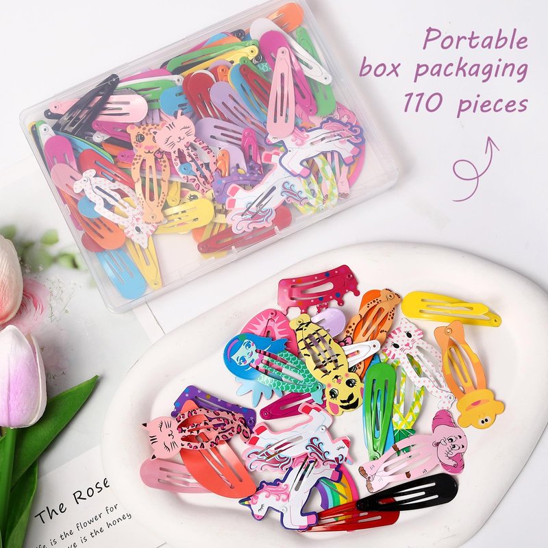 - π₯Get ready to turn heads with our 110-piece, TOP-NOTCH hair clip set!π₯ Hey, girls of all ages! π§π©βπ¦° Looking to jazz up your hair game? We've got you COVERED! Our VALUE-PACKED set is bursting at the seams with colorfully printed, snap metal barrettes. πβ¨ Say GOODBYE to boring hairstyles and HELLO to endless, enchanting hair looks. πββοΈπ« Our anti-slip clips won't let you down. They're the MUST-HAVE accessory to instantly add a pop of charm to any outfit. ππ