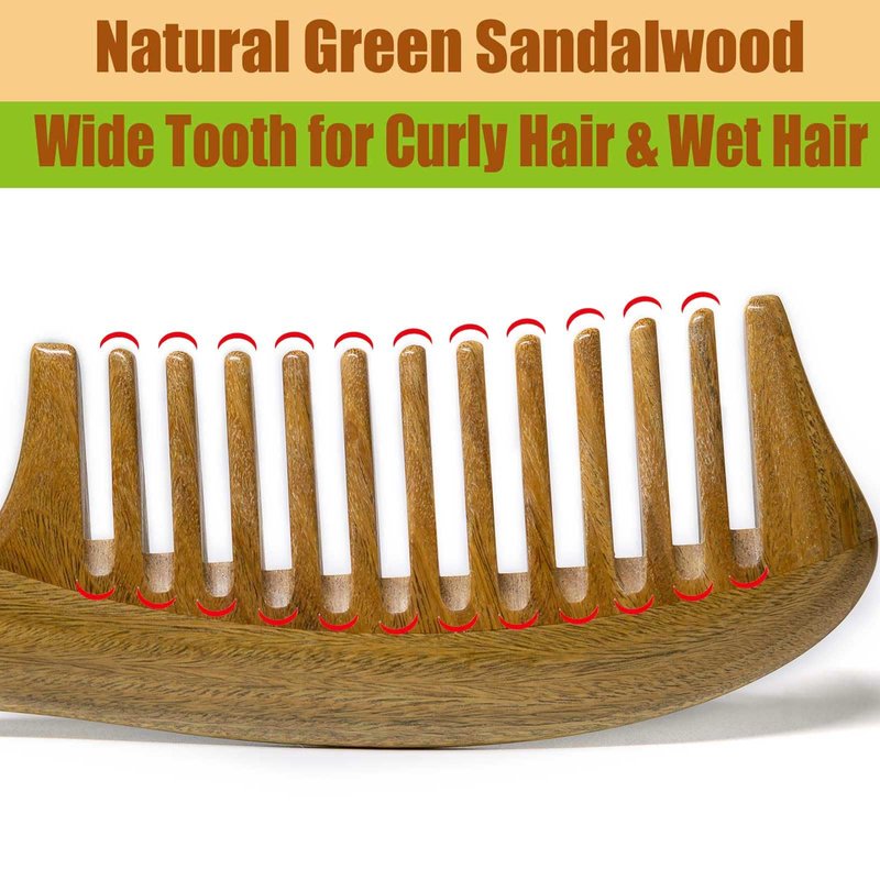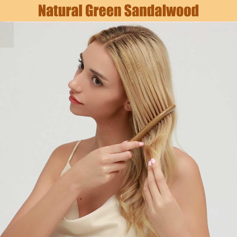 - Made of solid green sandalwood, the wooden hair comb is well polished with natural and lasting fragrance. After dozens of traditional craft processes, wide tooth wood hair comb with round tooth & U-shaped tooth grooves can smoothly go through your hair without hurting your scalp and skin