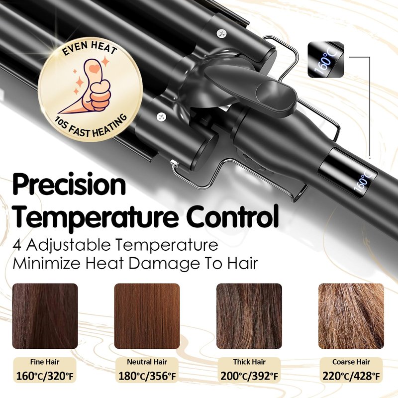 - [Heats Up Extra Fast & 4 Temperature Settings] The curling iron for hair could heat up in 30 seconds. The hair crimper has an adjustable temperature range from 320°F to 450°F, which suit all hair textures. 160℃/320℉ - suitable for fine hair; 180℃/356℉ - suitable for normal hair; 200℃/392℉ - suitable for thick hair; 220℃/428℉ - suitable for coarse hair.