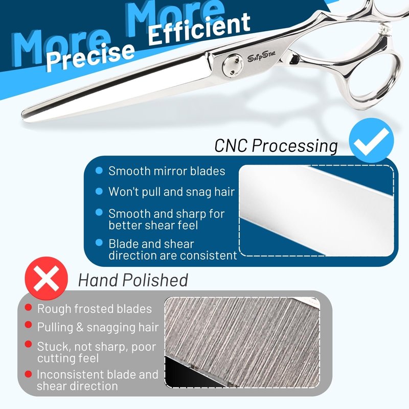 - 【We Solve Inaccuracy and Unsharpness Problem】professional hair cutting scissors are processed by CNC technology for greater precision than hand sharpened ones; the beveled opening sharpens the blade and reduces hair pulling and snagging; it glides effortlessly through the hair compared to straight blades.