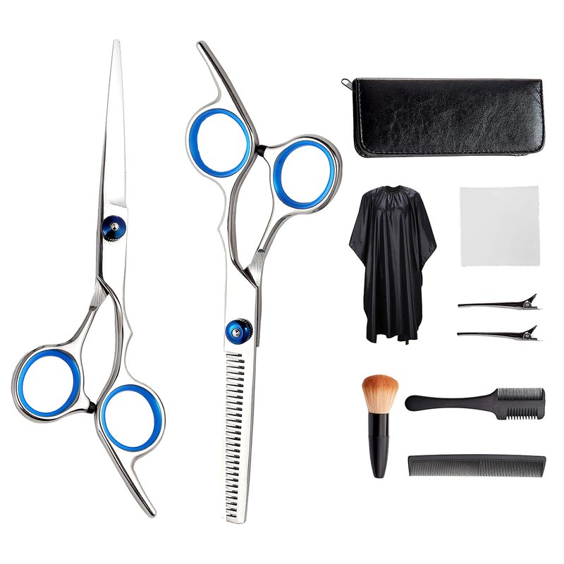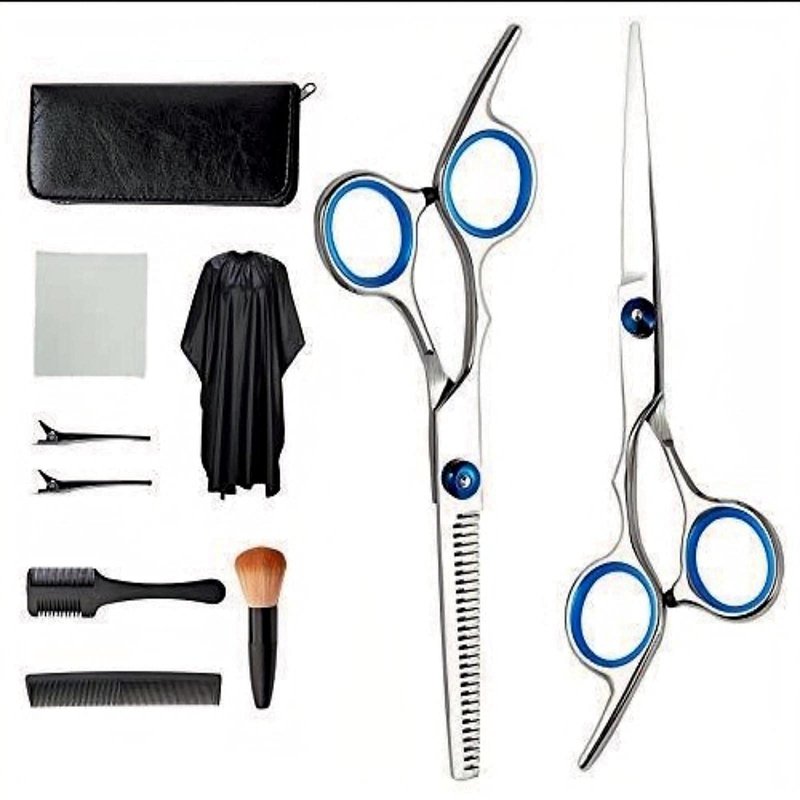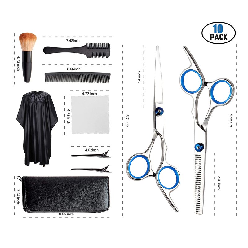 - [All-in-One Hair Cutting Kit] The hair cutting scissors kit meets all your hair cutting and styling needs:1 x Hair Scissor,1 x Thinning Shear,1 x Hair Razor Comb,1 x Comb, 2 x Hairpin , 1 x Leather Bag,1 x Hair Sweep Brush,1 x Cleaning Cloth,1 x Barber Cape(waterproof etter quality). Please refer to our graphic description section to help you quickly master their functions