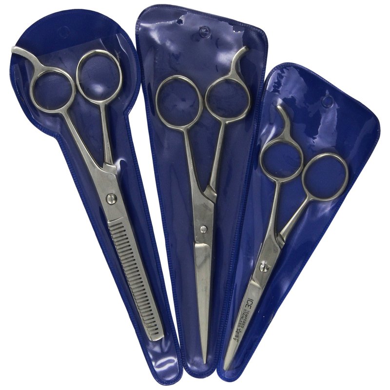 The 3 Pc Barber's Shear Set includes: 5.5" Barber Shears, 6.5" Barber Shears, and 6.5" Salon Thinning Shears. Cutting your children's hair at home is convenient and saves money, but to do the job right, you need the right tools. This 3 piece Barbers Shears set gives you will give you the professional tools at an affordable price. Barber Shears in two sizes for perfectly balanced trimming and cutting, plus Salon Thinning Shears for layering and texturing hair. Durable stainless steel with easy grip 'pinkie guard' handles.