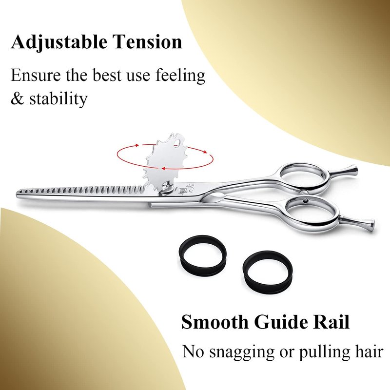 - ✄ERGONOMIC DESIGN - Non-slip handle, rounded tips and ergonomic shape with integrated finger rest for comfort allowing relax cutting. PREVENTS STRAINS on your fingers, wrists and arms caused by repetitive motion when cutting hair. Comfortable handle and adjustable screw are designed for the right tension level for you.