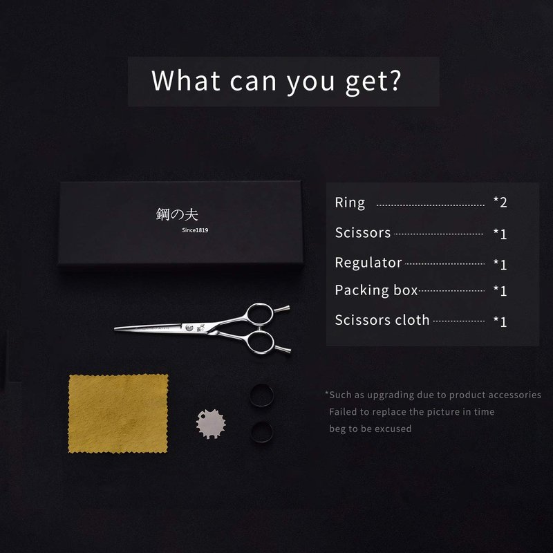- ✄PERFECT PRESENT - 1 X Hair Cutting Scissor, 2 X Ring, 1 X Regulator, 1 X Cloth, 1 X Exquisite Gift Box, 30-day unconditional return, and 365-day Warranty. If you have any problem with our Hair Scissors, please contact the seller to get a perfect solution. Warm Tips: Please do not open the scissors too much, which may make it difficult to close them again.(In normal use, it will not exceed 90 °, which is no problem)