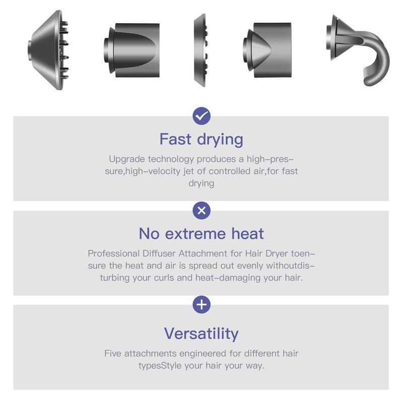 - 【Package Contents】:1pc Supersonic attachement - hair diffuser attachment,1pc Flyaway Attachment Nozzles,1pc styling concentrator nozzle, 1pc Smoothing Nozzle Tools Attachment,1pc gentle air attachment .It adopts magnetic design, easy to install and remove, and you can easily replace old or damaged hair dryer nozzles.