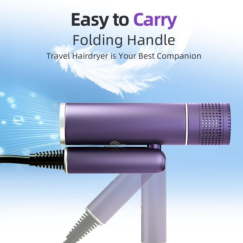 - Foldable, Compact, and Lightweight Its lightweight and slim design will help you avoid arm cramps when drying your hair.The foldable design hair dryer with our storage bag, easy to carry, easy to store, is a good partner for business trips or travel. You can pack it on the suitcase.
