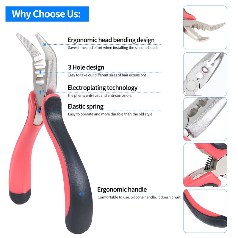 - [Upgrade Hair Extensions pliers]: Ergonomic head bending design, three-hole remove beads design, anti-rust nickel plating process, can quickly install and remove the micro link beads