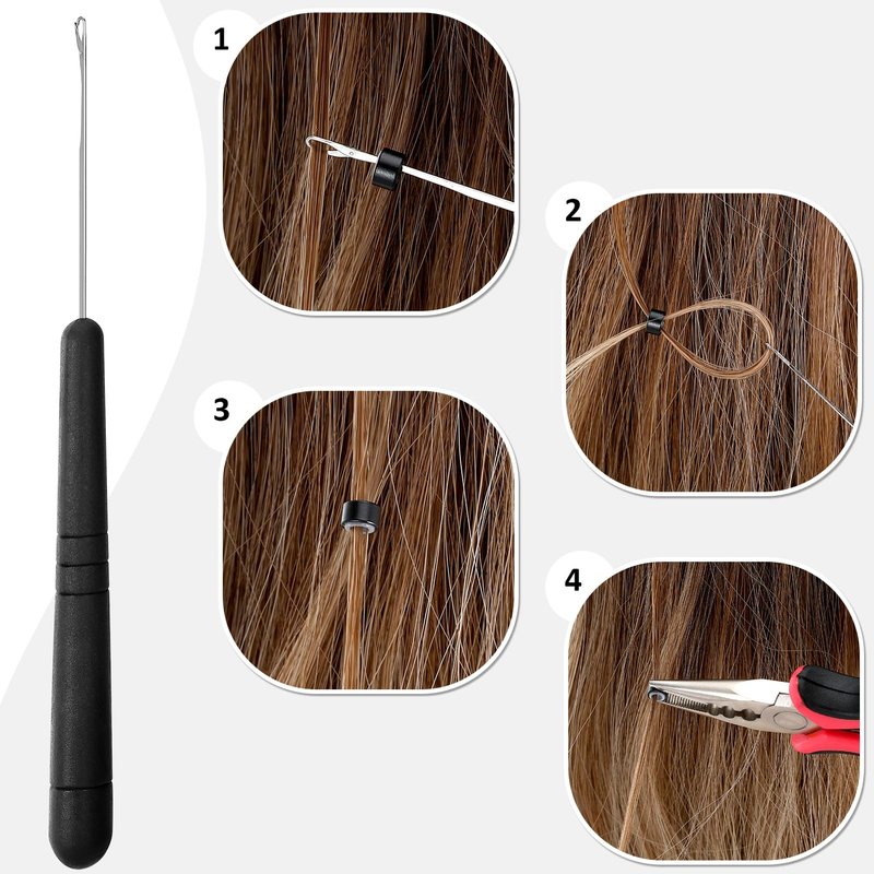 Hair Extension Tools Kit, 600 Silicone Lined Micro Rings, 1 Plier, 2 Hook Needle Pulling Loop, 10 Curved Hair Needle, 4 Metal Hair Clips, 1 Comb, 3 Sewing Threads, 200 Mini Rubber Bands