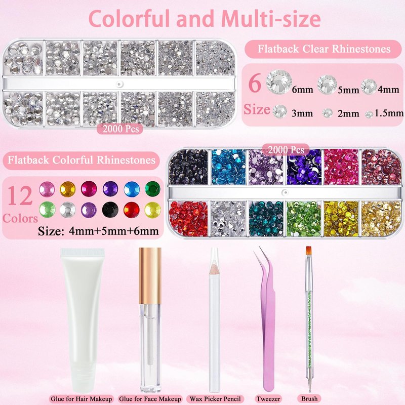 - 【Colorful and Multi-size】This hair rhinestones set provides 1 box of 12 colors flatback rhinestones(4mm, 5mm, 6mm); 1 box of clear rhinestones with 6 sizes(1.5mm, 2mm, 3mm, 4mm, 5mm, 6mm)