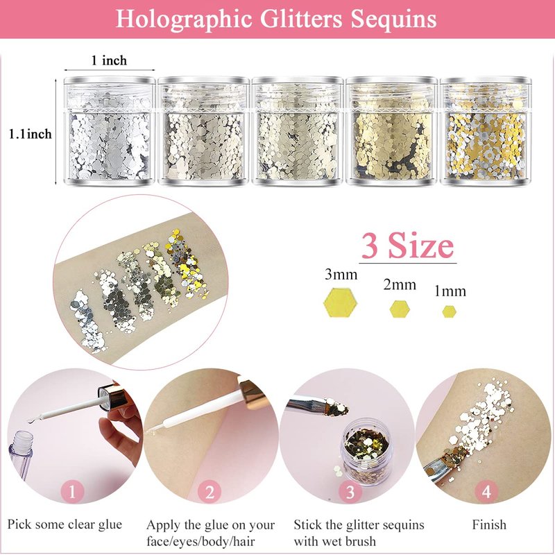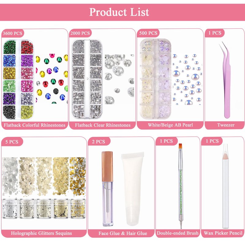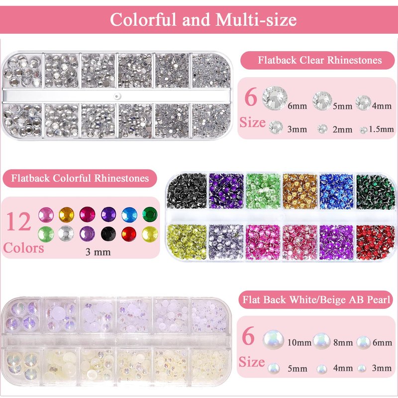 - 【Colorful and Multi-size】This face jewels set provides 1 box of 12 colors flatback rhinestones(3mm); 1 box of flatback clear crystal rhinestones with 6 sizes(1.5mm, 2mm, 3mm, 4mm, 5mm, 6mm); 1 box of flatback half round white&beige pearls with 6 sizes(3mm, 4mm, 5mm, 6mm, 8mm,10mm); 5 box holographic glitters sequins with 3 sizes(1mm, 2mm, 3mm)