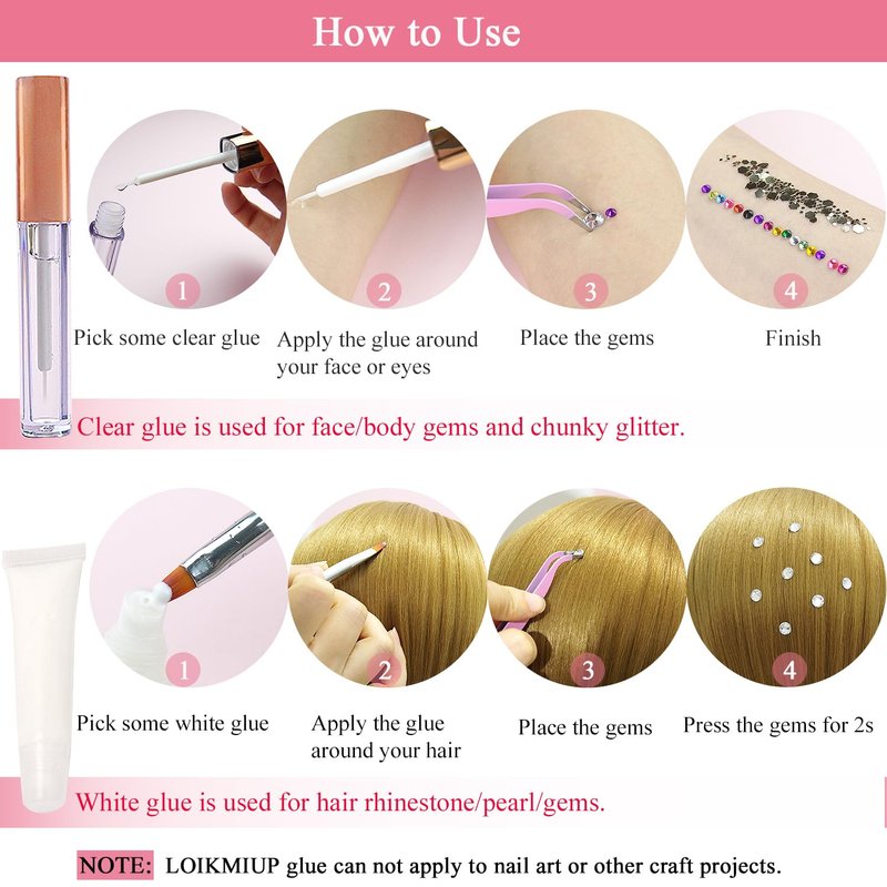 - 【Makeup Glue is Made for Face & Hair】Professional waterproof makeup glue is friendly for the skin, giving you 24hr long-lasting to hold the crystal rhinestones stay in your face&hair. You can use it to apply face gems, eye gems and glitter sequins