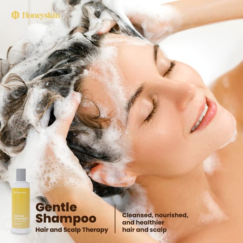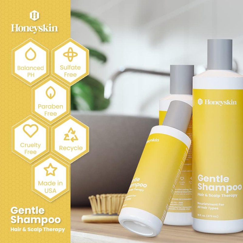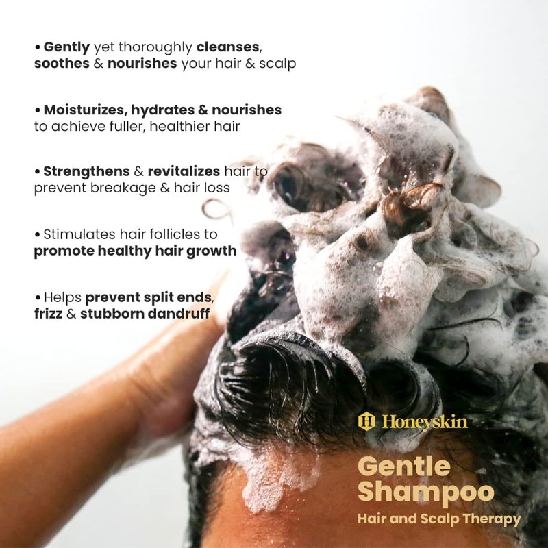 - CLEANSES, SOOTHES, AND HYDRATES - Honeyskin Gentle Hair Growth Manuka Honey Shampoo not only cleanses and removes dirt and impurities but also soothes and hydrates dry, itchy scalp, eczema, psoriasis, dermatitis, and more. This organic shampoo leaves your hair and scalp clean, balanced, and healthy.