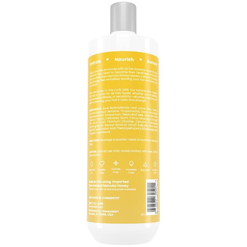 Our perfectly pH-balanced Honeyskin Ultra hydrating Hair Growth Shampoo and Conditioner Set will restore and nourish your hair and scalp using organic superfoods, vitamins, and skin-loving botanicals to leave hair and scalp clean, balanced, and healthy. This Gentle Manuka Honey and aloe vera shampoo not only cleanses and removes dirt and impurities but also soothes and hydrates dry, itchy scalp, eczema, psoriasis, dermatitis, and more. Our Manuka Honey Shampoo and Conditioner will keep your hair and scalp nourished and moisturized. Unlike ordinary hair care products, this organic shampoo and conditioner set replenishes rejuvenating moisture, preventing frizz, split ends, breakage, and dandruff. This hair moisturizer and hair growth shampoo for women also helps stimulate hair follicles for healthy and natural hair growth. Our sulfate free shampoo and conditioner for color treated hair will help you achieve not only softer and smoother locks but also healthier, thicker, and fuller-looking hair.