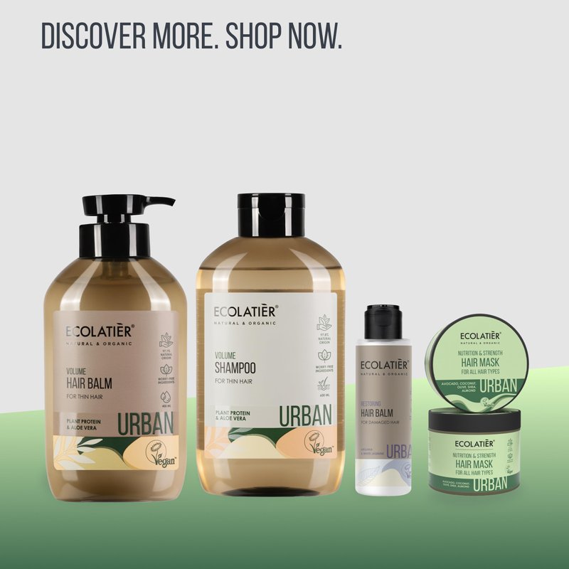 Discover the world of intensive hair care with the ECOLATIER URBAN Series Hair Mask Nutrition & Strength for all hair types. This hair mask offers an extraordinary blend of natural ingredients and cutting-edge technology to pamper and protect your hair in every way. The mask's formula contains avocado oil, which saturates the hair with nutrients, protects it from brittleness and stress, and imparts a silky shine. Coconut oil is known for its deep-acting care, restoring hair structure and nourishing hair follicles, leading to strong and healthy hair. In addition to these powerful oils, the hair mask also includes shea butter, which strengthens the hair along its entire length, improves texture, revitalizes and protects hair color, and promotes active hair growth. Olive oil stimulates hair growth, repairs damaged and split ends, provides deep moisture, and gives natural shine. Almond oil strengthens and nourishes the hair, increasing elasticity and shine. Moreover, our hair mask contains Croton Lechleri resin extract (Dragon's Blood), Moringa extract, and vitamins B5, B6, C, E, which stimulate cellular detoxification, regenerate the skin, exhibit high antioxidant activity, and improve skin barrier functions. The result is healthy, shiny, and silky hair. The application of this hair mask is simple and effective: Apply it to clean, wet hair, leave it on for 2-5 minutes, and then rinse with warm water. Our products are intended for external use only. Choose ECOLATIER URBAN Hair Mask Nutrition & Strength for comprehensive hair care that prioritizes both effectiveness and ethical beauty. With each of our hair products, you make a statement for conscious and sustainable beauty care. Trust ECOLATIER to give your hair the care it deserves – for a radiant, healthy look every day.