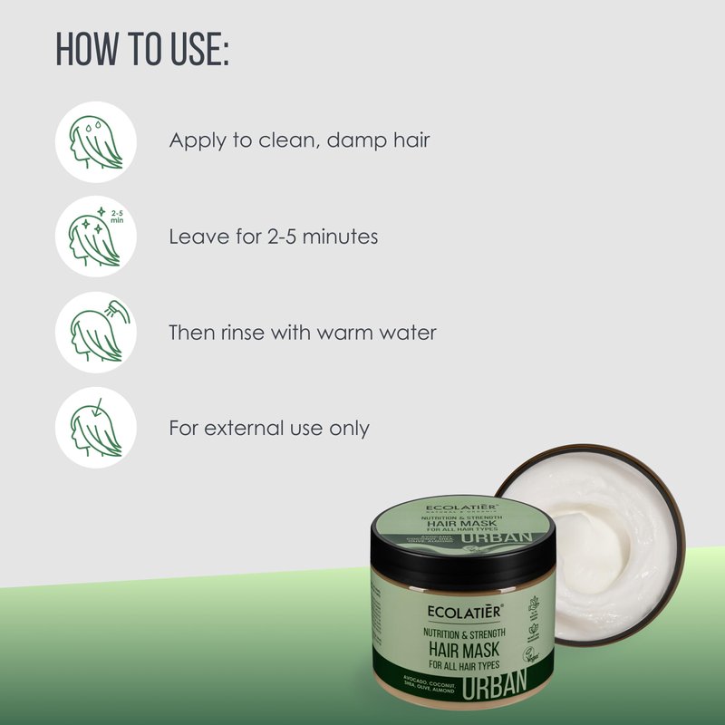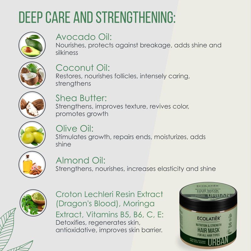 - 🌿 Hair Mask of Exceptional Quality: The ECOLATIER Urban Deep Conditioning Hair Mask for very dry hair offers comprehensive hair care. Enriched with avocado oil, it provides nourishment and strength for all hair types and delivers hair gloss.