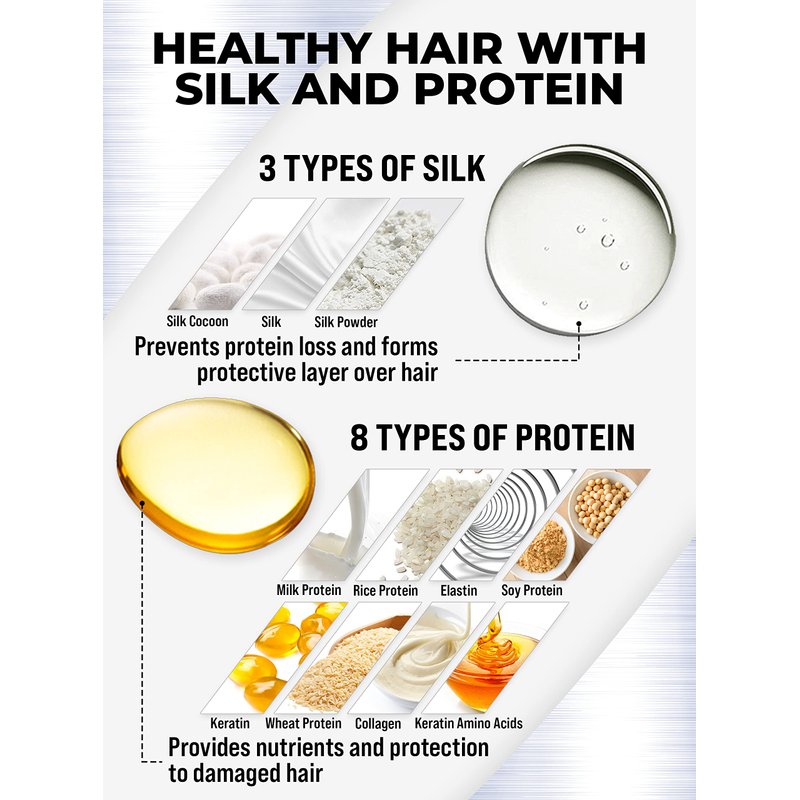 - ESSENTIAL INGREDIENTS. This shampoo contains essential ingredients like silk and protein that will make your hair healthier than ever before! Equipped with 3 kinds of silk (cocoon, silk, and silk powder), this shampoo will prevent protein loss. While preventing protein loss, this shampoo also contains 8 types of protein (keratin, collagen, wheat protein, bean protein, elastic, keratin amino acid, rice protein, milk protein) protecting hair from damage.