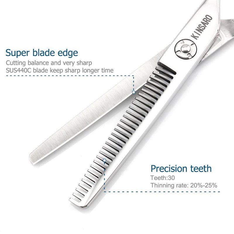 - Features: 440C convex blades,very sharp,keep sharp during long working life.Professional 30 V teeth thinning shears,thinning rate 25%-30%.Well-proportioned honed edge line and slide way,very well cutting balance.Japan ergonomic handles design,reduce fatigue when use long time.The scissors blade body is forged,and the strength is better than that of laser cutting scissors blade body.