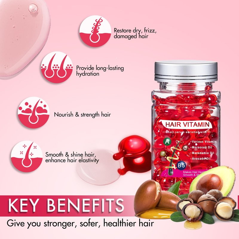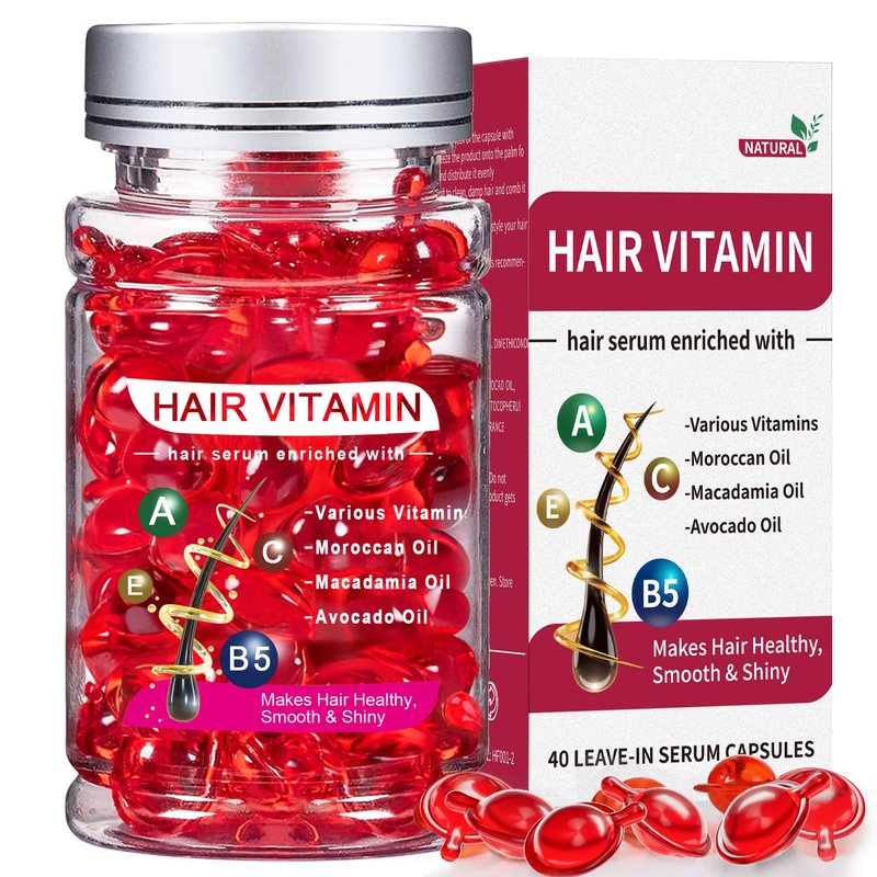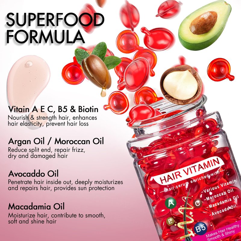 - Moisturizing & Nourishing Hair: This hair serum for dry damaged hair is enriched with vitamins A C E Pro B5, as well as several kinds of natural hair treatment products, such as Argan oil, Avocado oil, Moroccan oil and Macadamia oil. While deeply nourish and moisturize hair, this hair vitamins capsule protects hair from heat and sun to avoid of a heavy and greasy hair