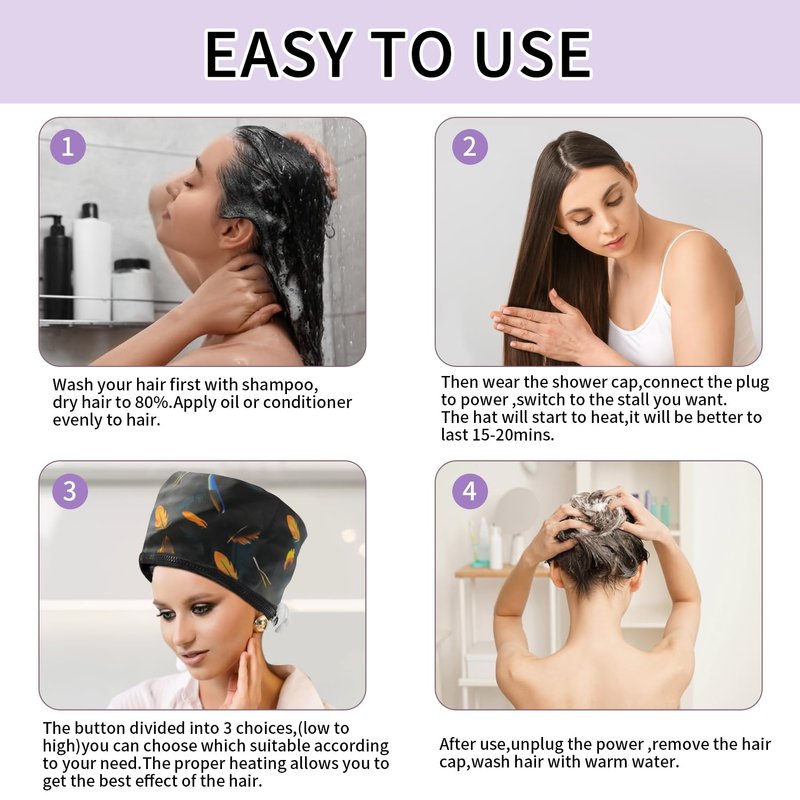 Hair Steamer Cap, Portable Hair Care Hat with 10 Mode Temperature Control, 110V Electric Heating Cap for Hair SPA Beauty Steamer Nourishing Hat Hair Thermal Treatment Cap (Black Feather)