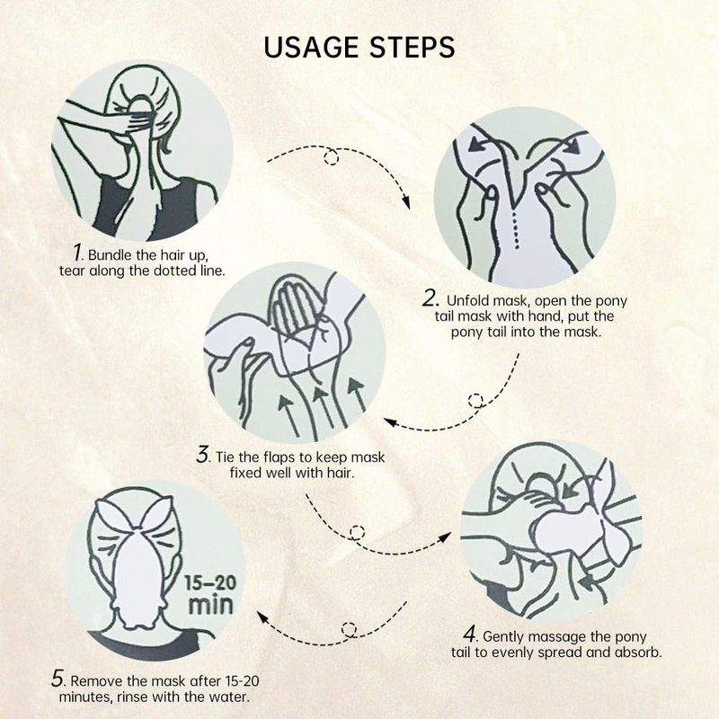 1.Bundle the hair up, tear along the dotted line.2. Unfold mask, open the pony tail mask with hand, put the pony tail into the mask 3. To keep mask fixed well with hair.