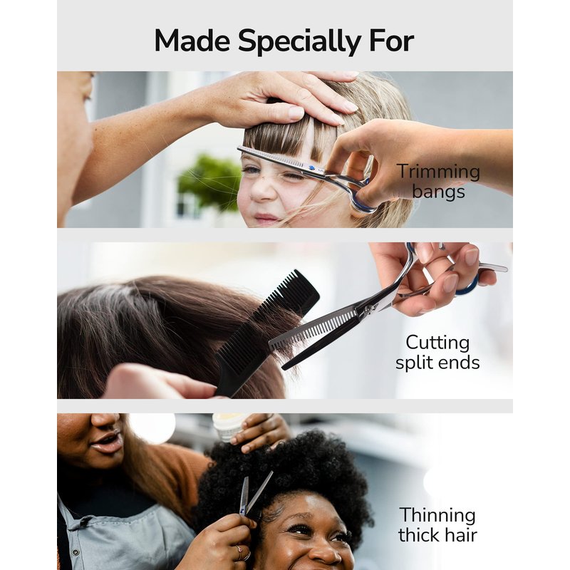 - Premium Material - Made from 100% Japanese stainless steel hair thinning scissor with precise thinning blades and hand-sharpened thinning edges to evenly trim hair with ease.