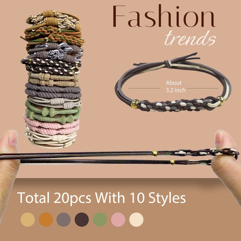- 【Soft & Stylish】 You will get 20 pcs hair tie bracelets, 5 different styles, 10 colors for each stlye, enough quantity and styles to meet your daily needs, this hair tie has an artistic pleasing boho style which can be worn both as a hair tie and as a bracelet. A stylish bracelet when it's on the wrist and a hair tie when you need to tie your hair. Unique and distinctive in a crowd of bright hair ties everyone always uses.