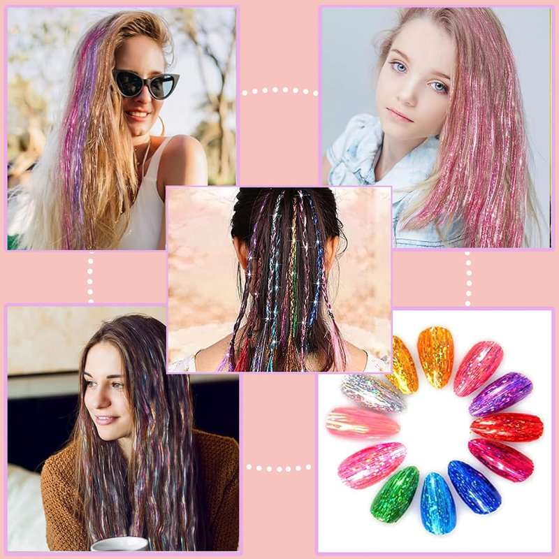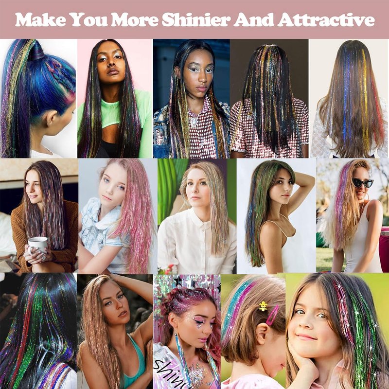- 【Suitable for many occasions】Our Glitter Hair Extensions can also be used for music festivals, cosplay, weddings, parties, Halloween and Christmas. Also, the hair tensile can also decorate your hats, bags, balloons, gift wrap and more.