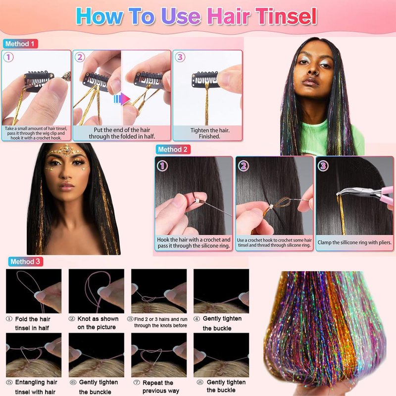 - 【Easy to Use】 Tie a knot and fix tinsel hair on your hair, tinsel hair can last several weeks, even suffer from washing, drying, and flat ironing. You can also use the silicone link rings to hold your hairs tightly and have no harm to your hairs, thus you can change your hairstyle quickly and easily.