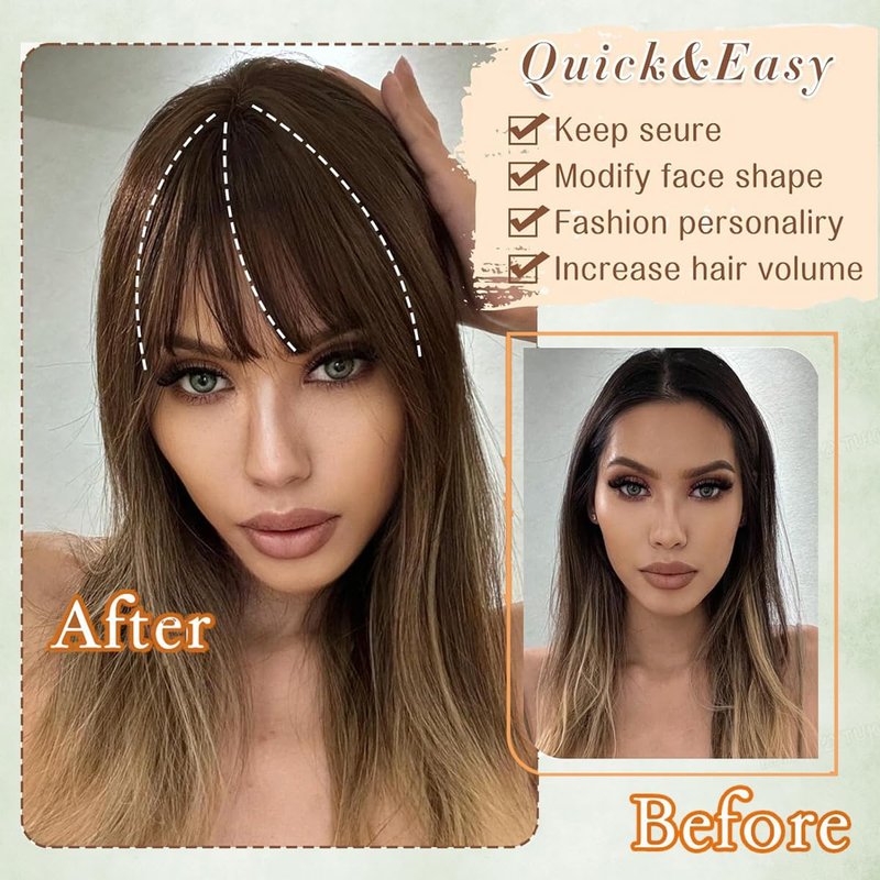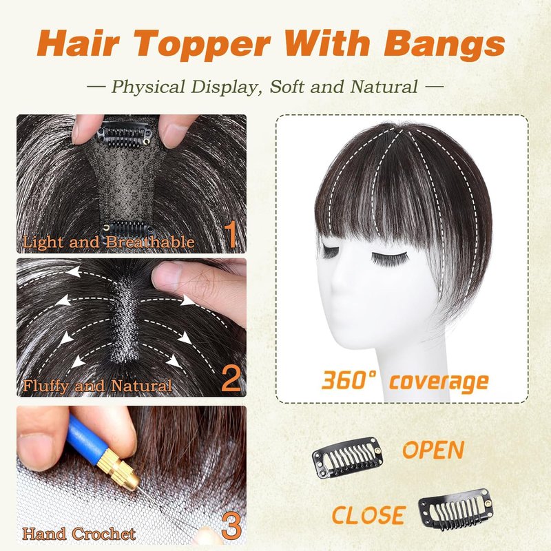 - 【Easy to use】Easy to wear and remove in seconds with 2 anti-slip clips. Upgraded anti-slip design keep the hair topper stay firmly in place all day long. It can add instant fullness on your top area, clips are secure and undetectable even on your thin front hairline. Clip-in Bangs design makes it easier to wear, and becoming cute and sexy attractive in one second And making you look more attractive. No one can find your secret.