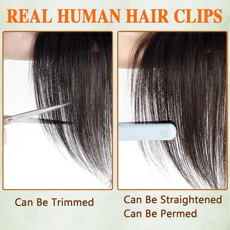 - 【100% Human hair】This bangs clip is made of 100% human hair clip on bangs,real size, very soft and healthy,just like your own hair.It can be curled, straightened or dyed into other colors and styles as you like.