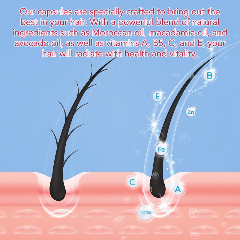 - HAIR VITAMIN CAPSULES: Hair treatment serum is a concentrated leave-in serum designed to nourish hair. This serum has a unique blend of fatty acids, antioxidants and vitamins, including Moroccan, Macadamia and Avocado oils, as well as Vitamins A, B5, C and E.