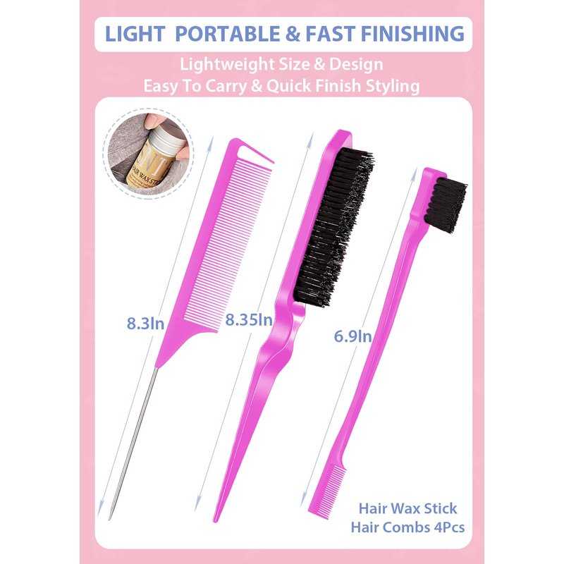 Quantity: 1PCS【Hair Wax Stick】+1PCS【Rat Tail Comb】+1PCS【Teasing Brush】+1PCS【Edge Brush】
