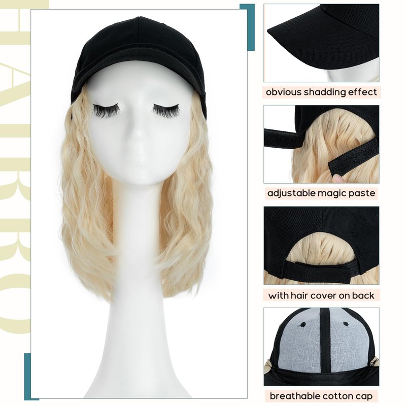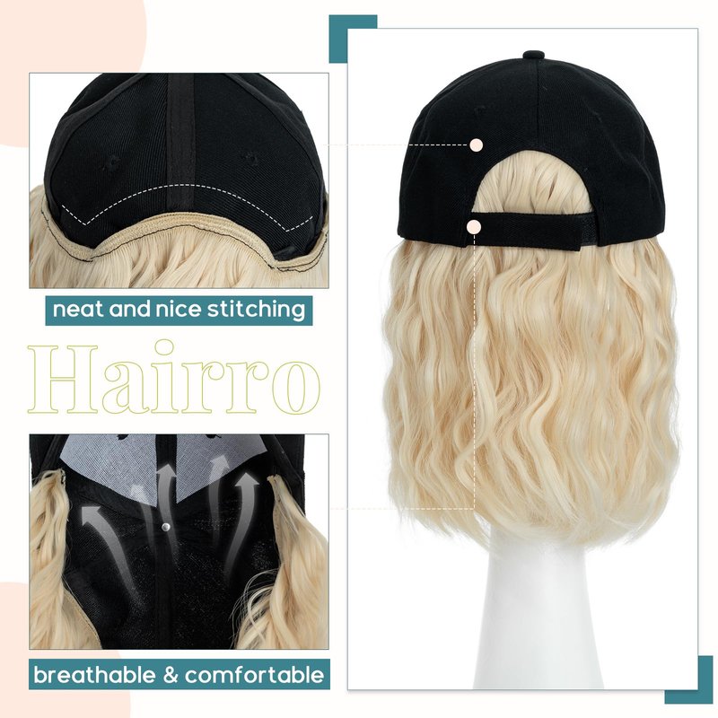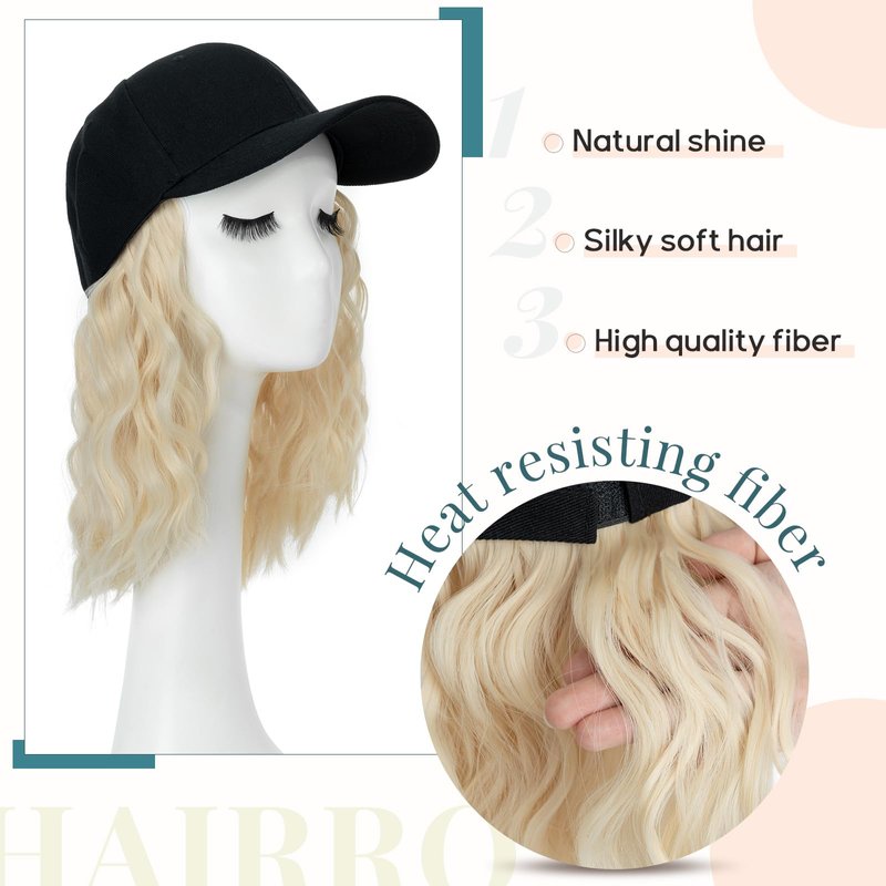 - ★ Hairro baseball cap with hair attached for women, cute short bob style with wavy texture hair,looks fuller and buncy. Made with high quality synthetic fiber, comfortable and silky soft, as natural as human hair