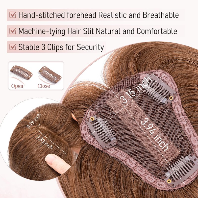 1. Hand-stitched forehead: Realistic and Breathable; 2. Machine-tying Hair Slit:Natural and Comfortable; 3. Stable 3 Clips for Security; 4. Pros: Ideal for Thinning Hair/Hair Loss/Covering Greyish Hair; 5. Change Your Look Anytime as You Want: It can be washed/cut/straightened/curled and dyed.Tips: