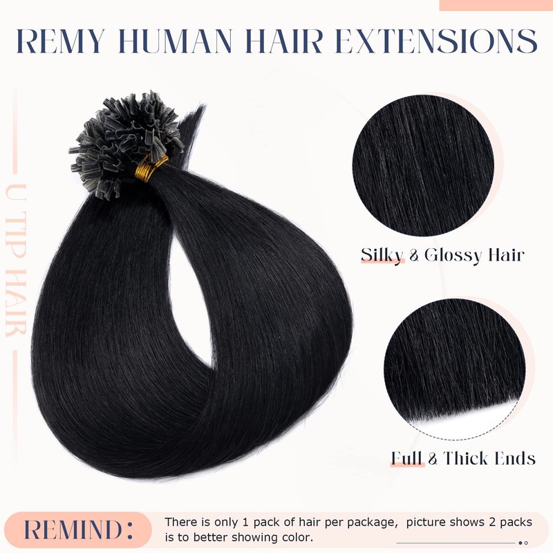 Hairro U Tip Hair Extensions Remy Pre Bonded Fusion Hairpieces Utip 100% Human Hair U-tip Nail Tipped Keratin Glue Stick Microlink Hair Extension For Women 100 Strands 14" 50g #1B Natural Black